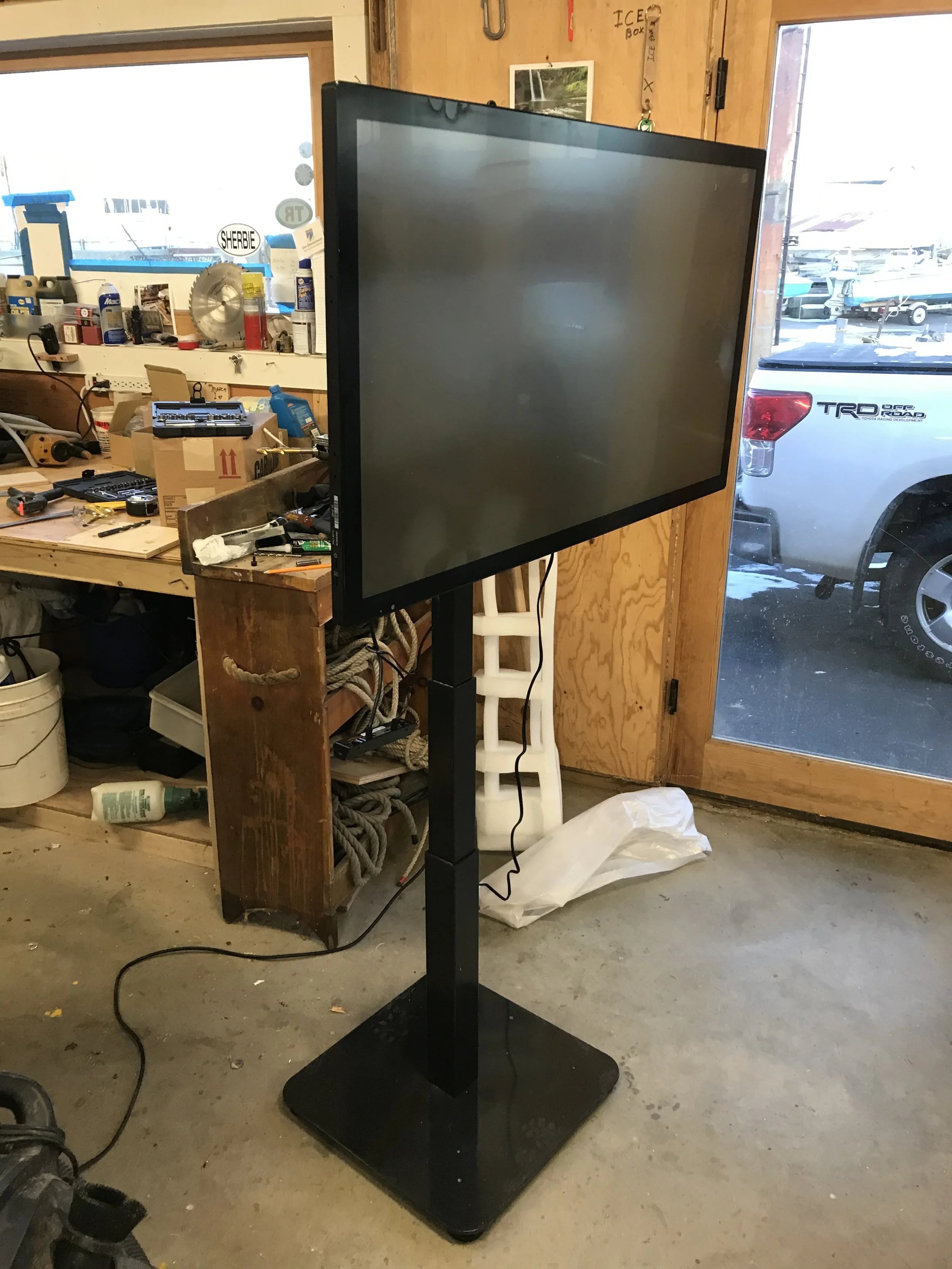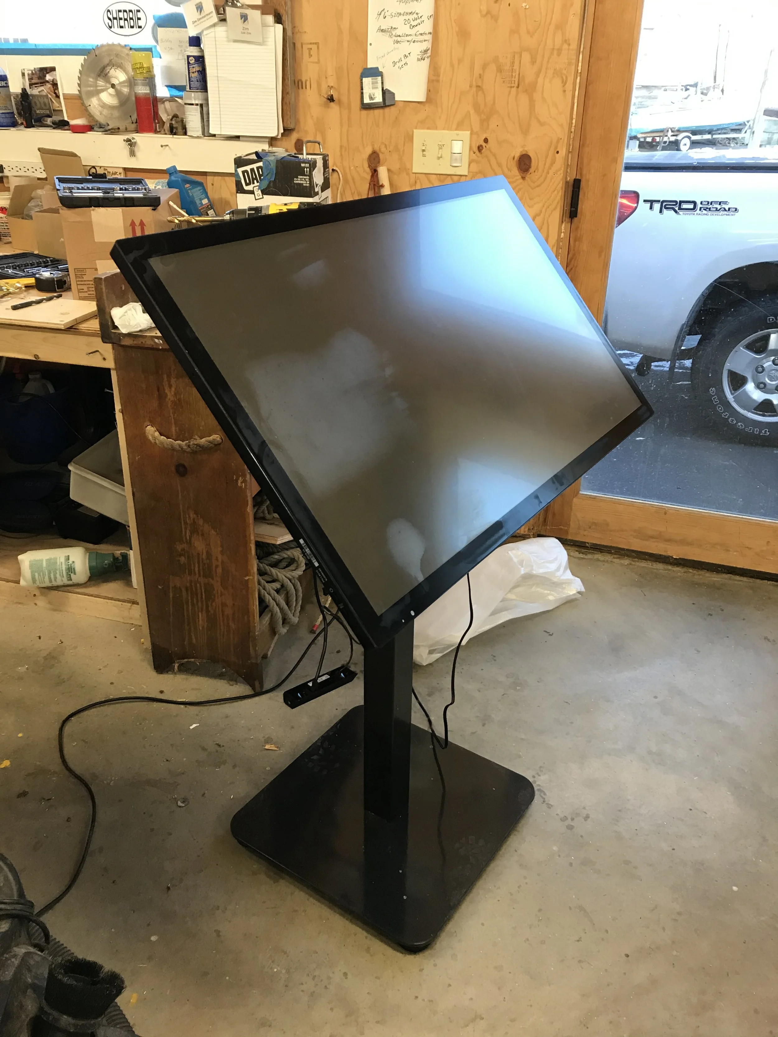 Version 2 was a smaller, 40” touchscreen, mounted on hinges to an electrically adjustable-height stand. This version had a greater range of heights (lower to accommodate shorter and seated users, and higher for greater presentation visibility) and did not require tools to adjust the height or angle.